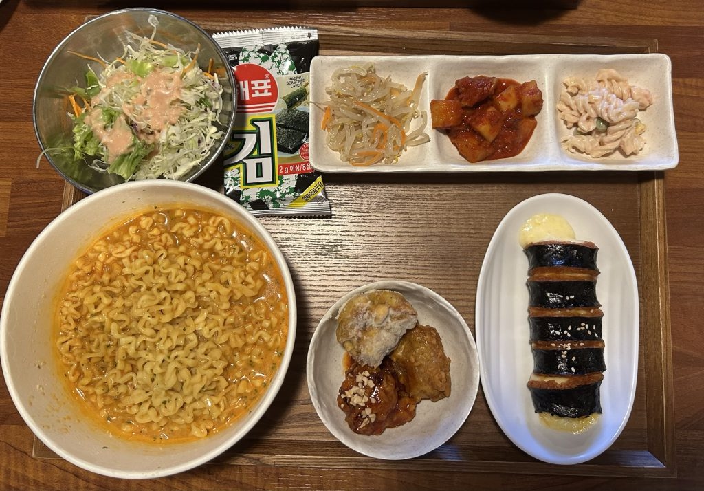 チーズがびよーんと伸びるチーズキンパに、フライドチキンはヤンニョムとハニーバターの2種類。さらにキャベツサラダ、韓国のり、おかず3点と、とにかくボリューム満点です。韓国ラーメンは食べ放題ですが、おかずの量も多く、非常に満足感のあるセットでした。
